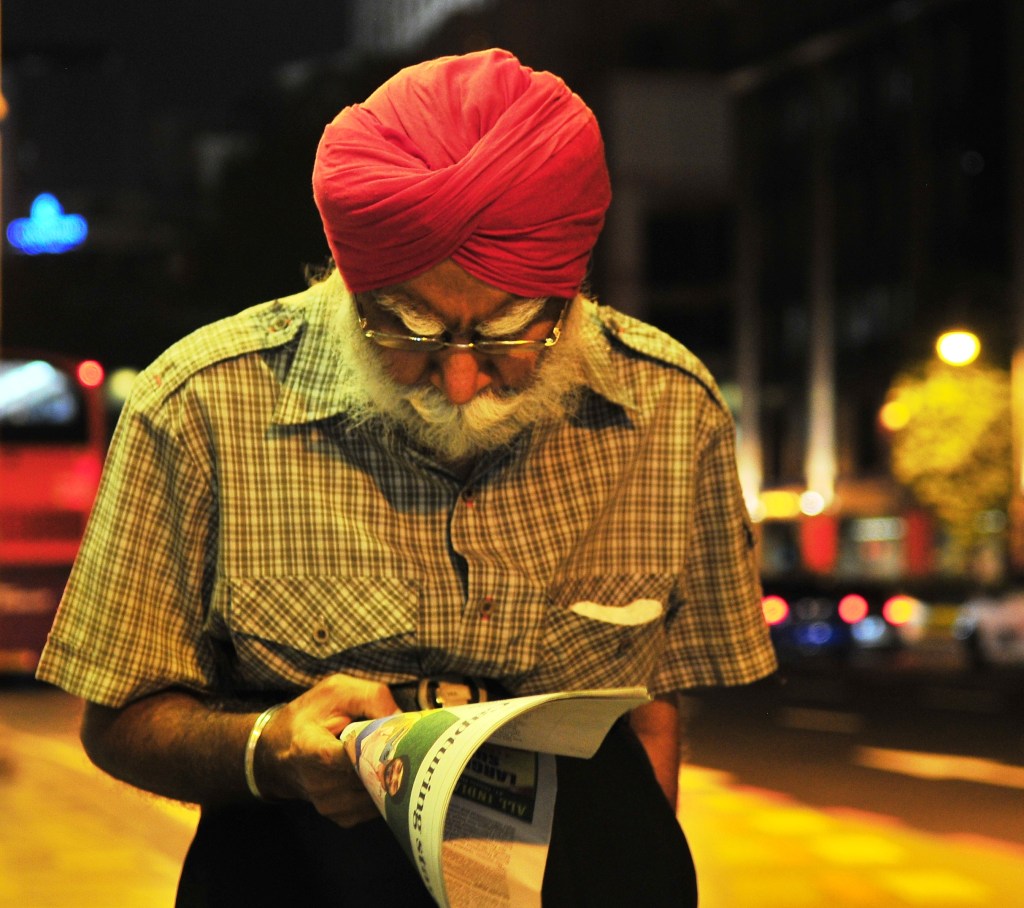 Man met krant in Singapore